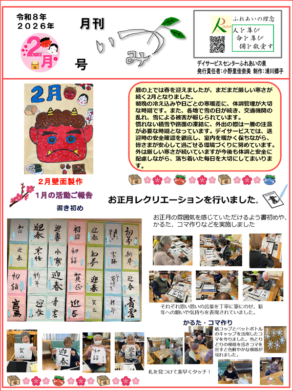 月刊いづみ2月号では、初詣やお正月レクリエションの様子をお届けいたします。