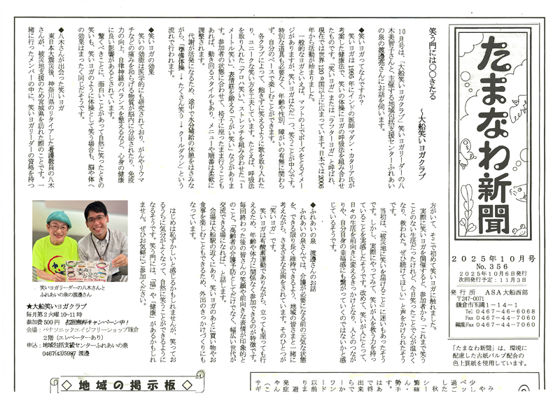 地域包括支援センターふれあいの泉が主催する「大船笑いヨガクラブ」が、朝日新聞の「たまなわ新聞」から取材を受け、掲載されました!